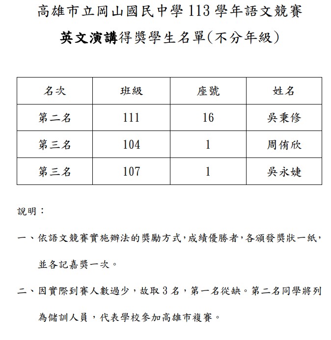 公告:113學年度校內語文競賽【英文演講】得獎名單